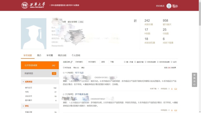 成果库尽可能全面地收集整理了学校教职工所有学术成果的题录信息,包括已公开发表(署名西华大学,包含学校历史各时期曾用名)的中英文论文著作、授权的专利,以及科技处确认的纵横向科研项目(目前系统仅收录本人为课题负责人的项目)和科研奖励等,数据及时更新,教职工可利用该成果库预览并下载中国知网所收录的所有文献。教职工登录后可将本人全部学术成果等相关信息整体导出为word文档,形成个人学术简历,简历中包含了个人的基本信息、学术成果量、被引频次等,并有详细的科研项目、发表文章记录,为教职工梳理查询本人的学术成果,更好开展教学科研提供了便利。
