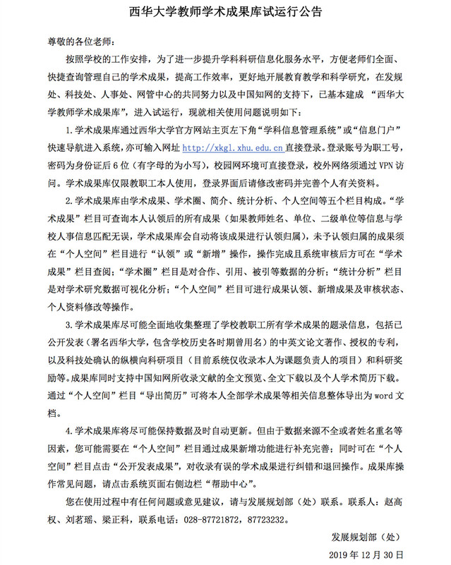 为了进一步提升学科科研信息化服务水平,方便老师们全面、快捷查询管理自己的学术成果,提高工作效率,更好地开展教育教学和科学研究,近日,在发规处、科技处、人事处、网管中心的共同努力以及中国知网的支持下,“西华大学教师学术成果库”上线进入试运行阶段。