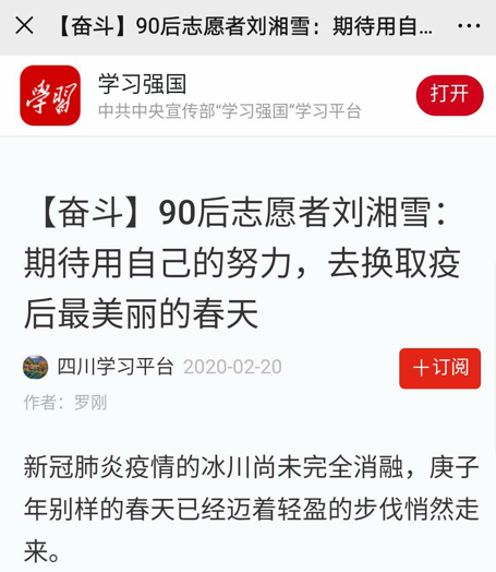 2月20日,“学习强国”平台以“【奋斗】90后志愿者刘湘雪:期待用自己的努力,去换取疫后最美丽的春天”为题,对我校大三学生刘湘雪志愿在家乡用行动守护村民的生命和健康的事迹作了宣传报道。现将原文转发如下: