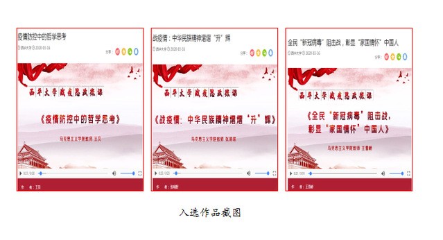 经过精心打造,王贝老师主讲的“疫情防控中的哲学思考”、王雪峤老师主讲的“全民新冠病毒阻击战,彰显家国情怀中国人”、张明晖老师主讲的“战疫情,中华民族精神熠熠升辉”三件作品入选全国高校思想政治理论课教师网络集体备课平台。