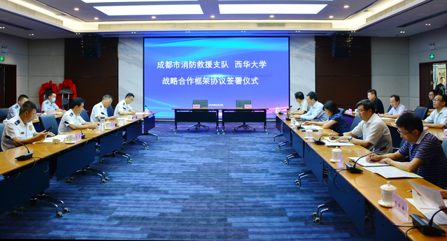 6月2日上午,成都市消防救援支队、西华大学战略合作框架协议签署仪式在学校办公楼101会议室举行。成都市消防支队党委书记、政治委员李健,支队党委副书记、支队长喻平文,支队党委委员、副支队长李勇,支队党委委员、副支队长朱健及成都市消防救援支队作战训练处、组织教育处、新闻宣传处、重点保卫处,郫都区消防救援大队相关负责人,我校党委书记边慧敏,副校长王政书、郑鈜及学校发展规划处、保卫处、学术期刊部、应急学院等单位负责人参加了仪式。仪式由郑鈜主持。