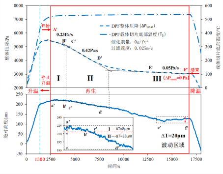 研究了DPF切片颗粒层的压降和厚度变化特性,可以明显看出再生时颗粒层的压降曲线随再生时间的增加呈现典型的三阶段变化,如图7所示。对于CDPF载体切片,载体表面碳黑氧化迅速,形成“自下而上”的氧化过程,如图8所示。
