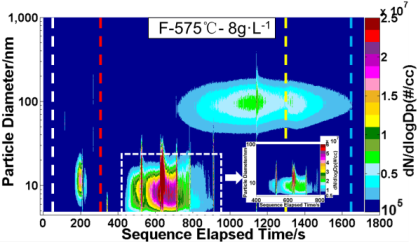 图4.发动机台架实物图 | 变化规律(575 ℃) | 图6. 捕集器再生出口颗粒 排放特性(8 g/L) |