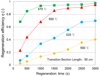 图1. DPF载体再生性能实验台 (专利授权号201210038593.1) | 图2. 不同过渡段长度对DPF再生时内部最高温度的影响关系 | 图3. 均匀沉积时再生时间对DPF再生性能的影响规律 |