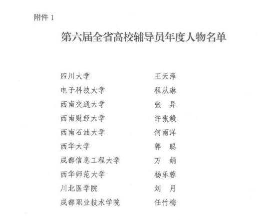 近日,中共四川省委教育工作委员会发布《关于公布第六届全省高校辅导员年度人物评选的结果》的通知,我校体育学院辅导员郭聪被评为“第六届全省高校辅导员年度人物”。