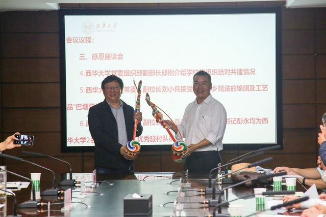 校精准扶贫工作领导小组办公室主任王丽娟介绍了自脱贫攻坚以来西华大学对水磨沟村的帮扶基本情况,并对今年10-12月将要开展的帮扶工作进行了介绍。校党委组织部副部长邱刚介绍了学校党组织结对共建的情况,并表示在下阶段将继续严格按照学校党委的要求做好党组织结对共建工作。副校长刘小兵接受了竹巴龙乡党委书记彭永均代表乡村干部群众赠送的锦旗、西华大学建校六十周年的校庆贺礼---巴塘弦胡。竹巴龙乡党委、政府授予我校驻村干部“优秀驻村队员”称号,会上,刘小兵和彭永均为他们颁发了荣誉证书。