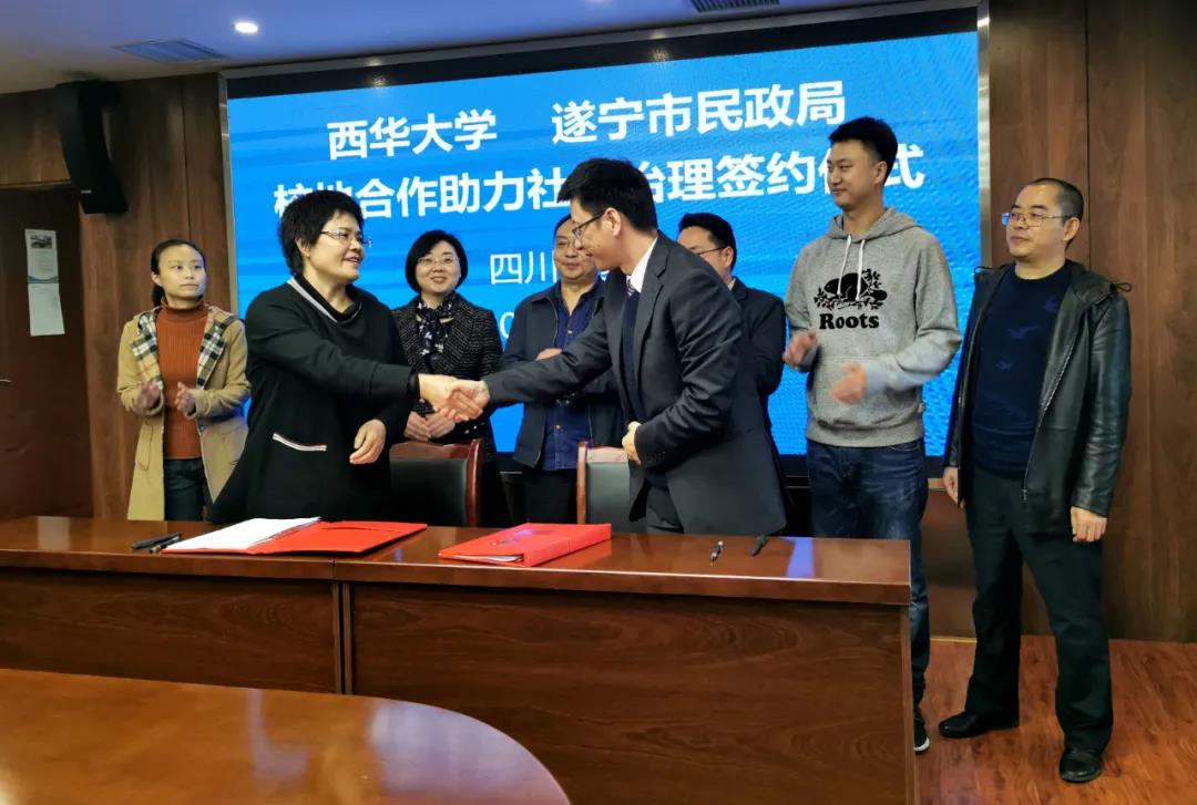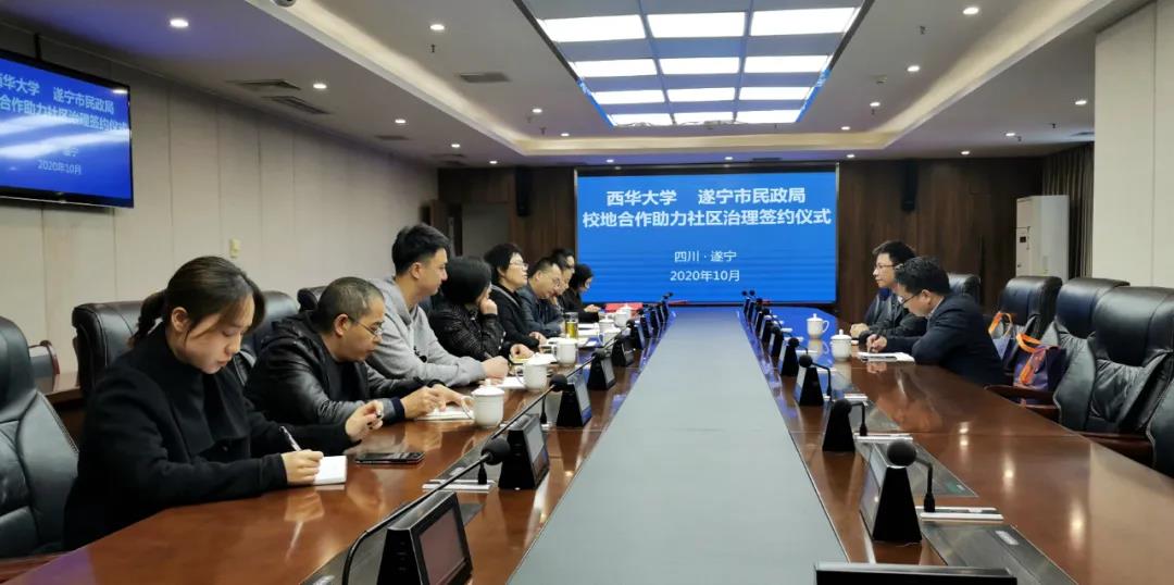 10月29日,遂宁市民政局、西华大学校地合作座谈会及签约仪式在遂宁市河东新区环岛商务中心举行。西华大学社会发展学院副院长冯永泰,遂宁市民政局党组书记、局长冯蓉志分别就合作背景、共建领域、推进机制等作讲话。遂宁市民政局党组成员、市委非公经济和社会组织工委副书记田贵凡主持活动。西华大学社会发展学院硕士生导师苏文明,遂宁市民政局相关业务科室、事业单位负责人参加活动。