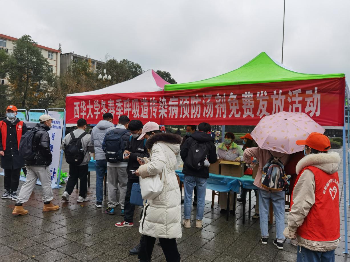 “这是按照四川省中医药管理局公布的处方熬制的汤剂,喝了可以预防感冒,每天一袋,拿回去要用开水温热,两天以内喝完哦,感冒了要及时到医院就诊。”活动现场,医生和青年学生志愿者们,克服阴雨寒冷天气,主动为前来咨询的师生科普冬春季健康常识和汤剂服用方法。领取汤剂的同学们感动的说道:“学校真的很关心我们,心里面觉得很温暖。”“这个汤剂发放活动既达到了预防感冒的目的,还提高了大家的防疫意识。”西华大学医院副院长沈慎介绍说,目前正处于冬春季传染病的高发季节,这个汤剂对于普通流感是有效的,能减少发病率,进而降低感染其他病毒的风险,但大家还是要加强自身锻炼,提高个人卫生意识,严格遵守学校疫情防控相关要求,做好个人防护,如有发热和其他呼吸道感染症状,特别是持续发热不退的,应主动戴上口罩,及时到医疗机构就诊。