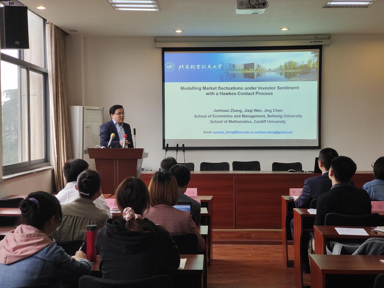 来自北京航空航天大学的张军欢副教授以“Modelling Market Fluctuations under Investor Sentiment with a Hawkes-Contact Process”为题作了报告。文章在传统Hawkes模型基础上,结合投资者情绪提出了一新Hawkes过程。结果表明,相比传统模型,新模型可以实现与实际收益率的紧密拟合。