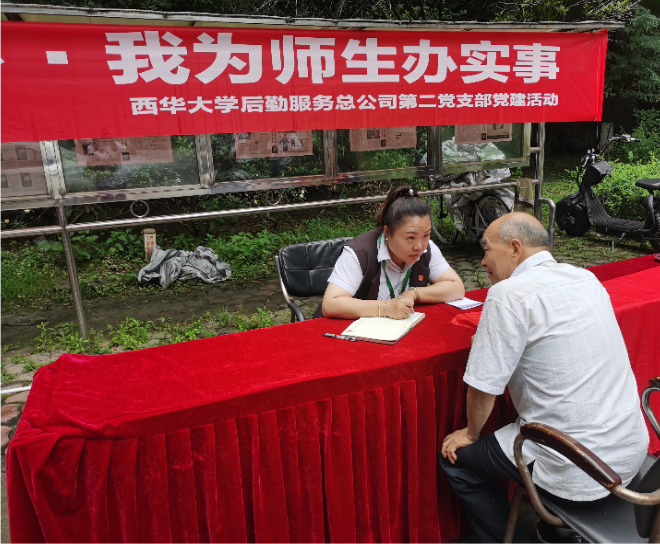 为贯彻落实《中共西华大学委员会开展党史学习教育实施方案》通知精神,按照学校及总公司党委党史学习教育安排部署,进一步推进党史学习教育活动持续开展,第二党支部把推动党史学习教育与解决实际问题有机融合,切实把党史学习教育贯穿于后勤保障服务工作全过程,增强“干实事”、为师生“解难题”、为民办实事的思想自觉和行动自觉,培养党员公仆意识和为民情怀,提升服务意识,突出学史明理、学史增信、学史崇德、学史力行;切实做到学讲话、感党恩、见行动,组织开展了此次为民服务活动。