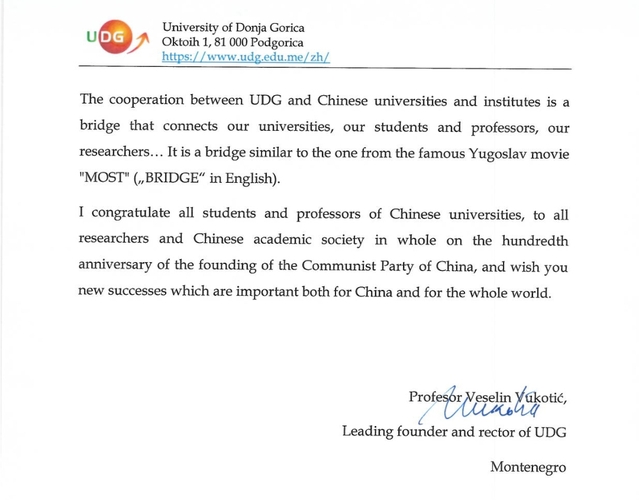 6月28日,黑山最大私立大学下戈里察大学校长韦塞林·武科蒂奇向我校致贺信,祝贺中国共产党成立100周年。