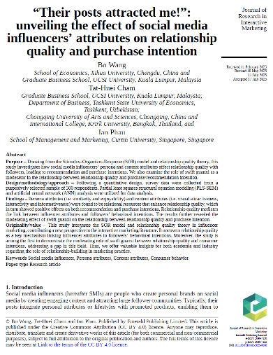 近日,经济学院王博副教授以第一作者身份在国际权威期刊《Journal of Research in Interactive Marketing》(SSCI一区,影响因子11.6)在线发表题为“‘Their posts attracted me!’: Unveiling the effect of social media influencers’attributes on relationship quality and purchase intention”的研究论文。马来西亚思特雅大学Cham Tat Huei教授、澳大利亚科廷大学(新加坡校区)Ian Phau教授为共同作者,西华大学为该论文的第一署名单位。