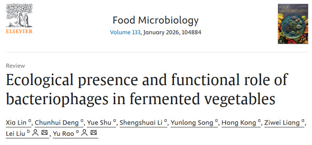 近日,食品与生物工程学院农产品贮藏与加工团队饶瑜教授等人在国际食品顶级期刊《Food Microbiology》(Q1,IF:4.6)发表题为“Ecological presence and functional role of bacteriophages in fermented vegetables”的综述论文。在国际微生物学领域权威期刊《Microorganisms》(Q2,IF:4.2)发表题为“Isolation, Characterization, and Preliminary Application of Staphylococcal Bacteriophages in Sichuan Paocai Fermentation”的论文。西华大学硕士研究生林霞为论文第一作者,西华大学饶瑜教授和兰州大学刘蕾青年研究员为论文共同通讯作者,西华大学为论文第一完成单位。