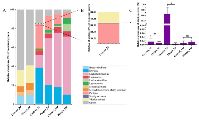 Figure 6. Microbial diversity composition on the 0th, 7th, and 14th days of fermentation (A) Stacked bar chart showing the bacterial community composition at the genus level; (B) Stacked bar chart illustrating the relative abundance of Staphylococcus in the control group on the 7th day of fermentation; (C) Relative abundance of Staphylococcus across different groups. Mean ± SD (n=3). (ns) p > 0.05, (*) p<0.05.