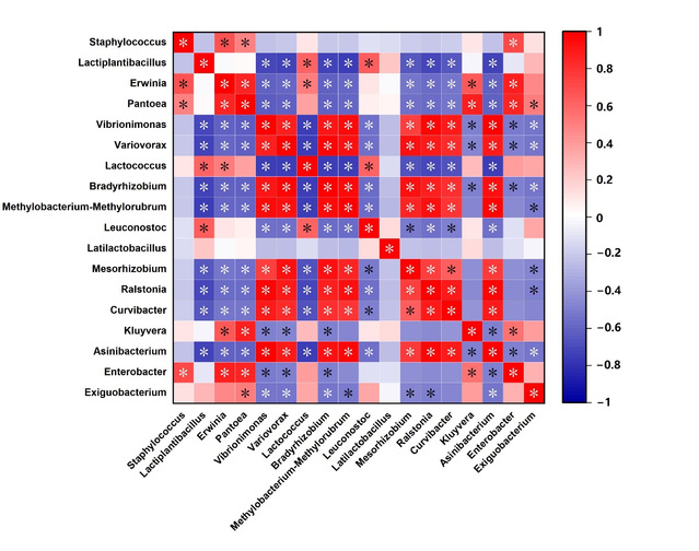 Figure 7. The correlation matrix mainly belongs to Spearman's rank correlation between attributes. (*) p<0.05.