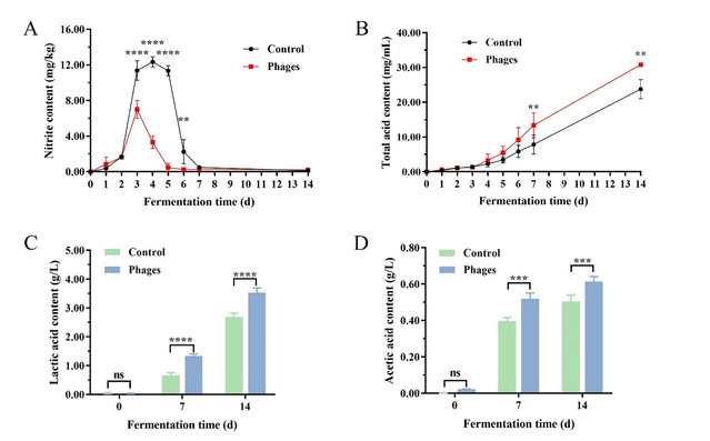 Figure 8. Changes in the contents of nitrite (A), total acid (B), lactic acid (C), and acetic acid (D) during the fermentation process of paocai. Data are expressed as Mean ± SD (n=3), (ns) p > 0.05, (*) p<0.05, (**) p<0.01, (***) p<0.001, (****) p < 0.0001.