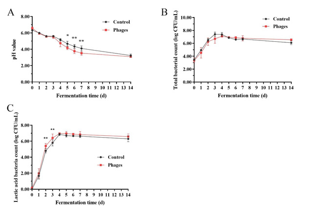 Figure 4. Changes in pH (A), total viable bacteria count (B), and lactic acid bacteria count (C) during the fermentation process of paocai (Control: paocai group without artificial inoculation of phages; Phages: paocai group with artificial inoculation of phages ΦSx-2, ΦSs-1, and ΦSs-2). Data are expressed as Mean ± SD (n=3). (*) p<0.05, (**) p<0.01.