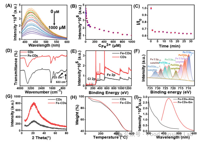 Fig. 1. (A) Fluorescence spectra, and maximum emission intensity at 429 nm of CDs in the presence of (B) different concentrations and (C) reaction time of Fe ion, (D) FTIR spectrum, (E) XPS spectrum, (F) Fe 2p spectrum in XPS of Fe-CDs, (G) XRD pattern and (H) TGA thermogravimetric curve of CDs and Fe-CDs and (I) UV absorption /fluorescence emission spectrum of Fe-CDs.