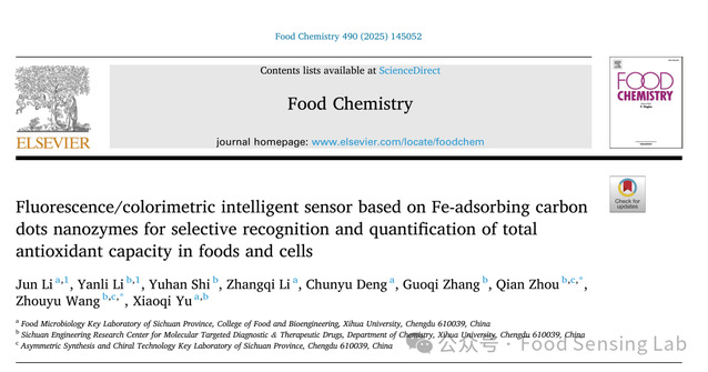 近日,食品与生物工程学院食品营养与安全团队李军老师在食品领域TOP期刊《Food Chemistry》(Q1,IF: 9.8)发表题为“Fluorescence/colorimetric intelligent sensor based on Fe-adsorbing carbon dots nanozymes for selective recognition and quantification of total antioxidant capacity in foods and cells”的研究论文。李军老师为论文第一作者,食品与生物工程学院研究生李艳丽为共同第一作者,理学院周倩副教授和王周玉教授为本文的通讯作者。