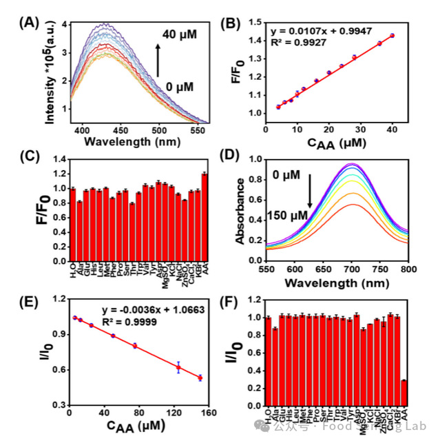 Fig. 5. (A, D) Fluorescence and UV–vis absorption spectrum of fluorescence and colorimetric intelligent sensor after adding AA, (B, E) Calibration linear curve of ΔF and ΔI versus AA concentration, and (C, F) Selectivity investigation of ΔF and ΔI under interfering amino acid and ions.