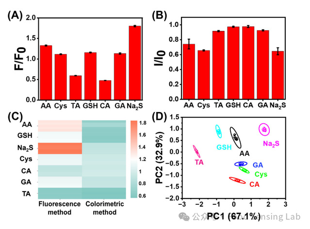 不断升级的氧化应激极大地增加了日需要量,总抗氧化能力(TAC)已成为重要的指标。因此,开发有效的TAC评价方法一直是研究热点。本文通过合理设计构建了一种基于Fe-CDs的荧光/比色传感器。基于铁吸附的策略将碳点的荧光猝灭,并通过添加抗氧化剂使其恢复,从而实现荧光检测。此外,该策略还赋予了Fe-CDs实现比色检测所必需的过氧化物酶(POD)活性。随后,作者构建了一种基于Fe-CDs的双模荧光/比色传感器阵列,对7种抗氧化剂进行了选择性识别,并对5种实际样品的TAC进行了准确评价。此外,Fe-CDs荧光/比色法检测果汁中抗坏血酸TAC具有良好的准确性和抗干扰性,检出限分别为2.1 μM和0.4 μM,线性范围分别为4 ~ 40 μM和6.3 ~ 150 μM。此外,Fe-CDs还可以通过荧光成像引导了细胞水平的谷胱甘肽含量的变化。