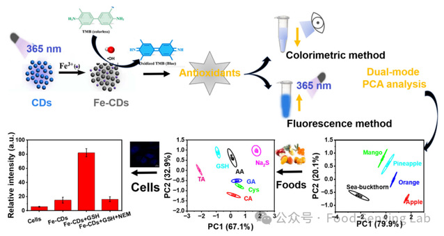 这项工作构建了一个基于Fe-CDs碳点纳米酶的荧光/比色智能传感器。合理设计的Fe-CDs既保持了CDs的荧光性能,又赋予其纳米酶活性。随后,成功开发了一种灵敏、选择性的双模传感器阵列,用于识别7种抗氧化剂(AA、Cys、TA、GSH、CA、GA和Na2S)。Fe-CDs通过自荧光响应抗氧化剂,并表现出优异的TMB氧化催化活性。由于抗氧化剂的还原能力不同,两个独立的传感器单元对抗氧化剂表现出独特的荧光/比色响应。荧光/比色传感器阵列已成功地用于TAC评价,以鉴定各种水果(沙棘、苹果、芒果、菠萝和橙子)。更重要的是,Fe-CDs已成功地用于实际食物和细胞中AA TAC或GSH的定性和定量检测。综上所述,基于铁吸附策略合理地开发了一种碳点纳米酶,其具有良好的荧光/比色传感能力。这项工作不仅为多功能纳米酶的合理设计提供了有价值的见解,而且还展示了它们在食品/生物分析领域的巨大实际应用潜力。