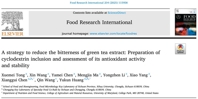 针对这一问题,课题组研究提出了环糊精包合-降苦协同策略,通过β-环糊精包合技术构建GTE/β-CD包合物。电子舌检测与结构表征结果显示,该包合物有效降低了苦味,同时保持了高抗氧化活性与稳定性,为绿茶提取物在食品领域的功能化开发提供了可行路径。相关研究成果发表在中科院一区TOP期刊Food Research International(影响因子8.0),论文题为“A strategy to reduce the bitterness of green tea extract: Preparation of cyclodextrin inclusion and assessment of its antioxidant activity and stability”,西华大学硕士研究生童雪梅、王新为论文共同第一作者,陈祥贵教授、黄玉坤教授为共同通讯作者,马里兰大学王芹教授共同指导。