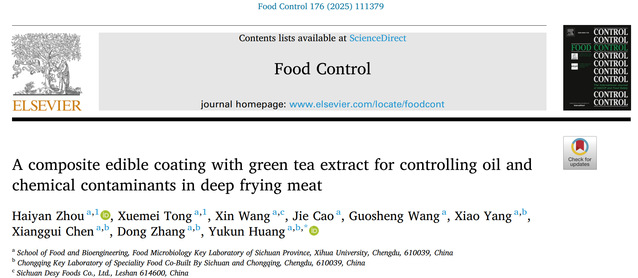 科研成果能否真正“落地”,是创新的关键。课题组进一步探索了茶叶成分在食品安全与品质提升中的应用,在中科院一区TOP期刊Food Control(影响因子6.3)发表论文“A composite edible coating with green tea extract for controlling oil and chemical contaminants in deep frying meat”研究论文(周海燕博士、童雪梅硕士研究生为共同第一作者,黄玉坤教授为通讯作者)。