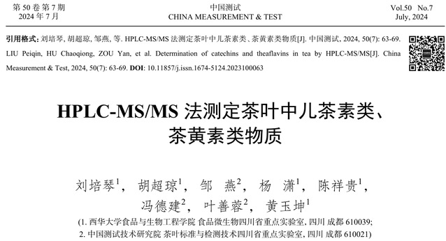 针对这一挑战,课题组联合中国测试技术研究院冯德建研究员团队,运用高效液相色谱–串联质谱(HPLC–MS/MS)技术,建立了茶叶中儿茶素类、茶黄素类物质与花青素类活性物质的高通量检测方法。该方法实现了多组分同步测定,大幅提升检测效率与灵敏度,为茶叶品质科学评价与不同品种间成分差异分析提供了可靠技术支撑。相关成果已发表于《中国测试》和《西华大学学报(自然科学版)》等期刊。