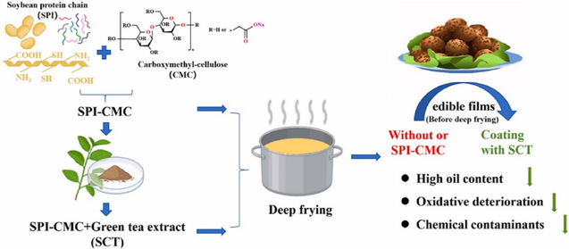 传统油炸食品虽深受消费者青睐,却普遍存在吸油率高、有害物生成及氧化劣变等问题,进而影响产品货架期。针对这一问题,课题组将上述研究获得的GTE/β-CD包合物引入大豆分离蛋白–羧甲基纤维素复合可食性涂层中,并应用于油炸肉制品。结果显示,该涂层可显著降低吸油率33.9%,同时有效抑制脂肪与蛋白氧化,减少丙烯酰胺、5-羟甲基糠醛等热加工污染物生成,显著延长产品货架期。这一创新策略为油炸食品安全升级与健康化生产提供了新思路,也展示了茶叶功能成分在食品工业中的广阔应用前景。
