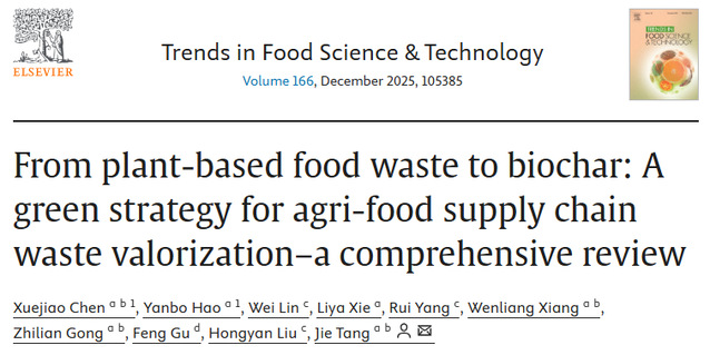 近日,食品与生物工程学院唐洁教授团队在国际食品Top期刊《Trends in Food Science & Technology》(Q1,IF: 15.4)发表题为“From plant-based food waste to biochar: A green strategy for agri-food supply chain waste valorization–a comprehensive review”的综述性论文。西华大学食品与生物工程学院、食品微生物四川省重点实验室陈雪娇副教授为第一作者,唐洁教授为通讯作者;食品与生物工程学院2023级农业专业硕士研究生郝彦波为共同第一作者。