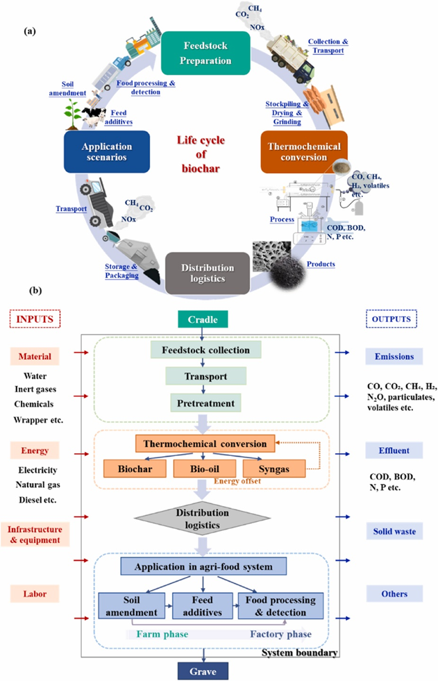 各类植物源食品废弃物均可以通过热化学技术快速转化为生物炭,从而实现较传统处理方式更为可持续的升级利用。然而,原料来源和转化途径的差异导致生物炭在理化性质上存在显著异质性。生物炭凭借其高碳含量、多孔结构、高比表面积和活跃的表面电化学特性等独特结构与功能,在作物生产、畜牧养殖和食品加工与安全检测等多个环节展现出广泛的应用潜力,为农业食品系统的绿色转型提供了可行路径。未来的研究中,技术创新仍是实现生物炭效益最大化的关键驱动力;同时,需结合全生命周期评价与技术经济分析,系统评估并最大限度地降低其生产和应用过程中的环境影响与经济成本。此外,推动国际协同的政策制定与标准统一,对于促进生物炭产业的规模化与规范化发展同样至关重要。