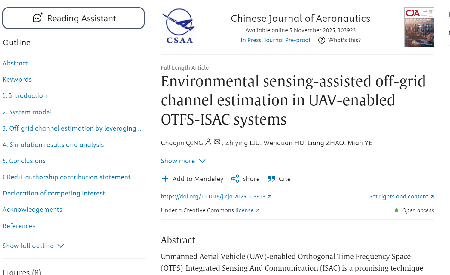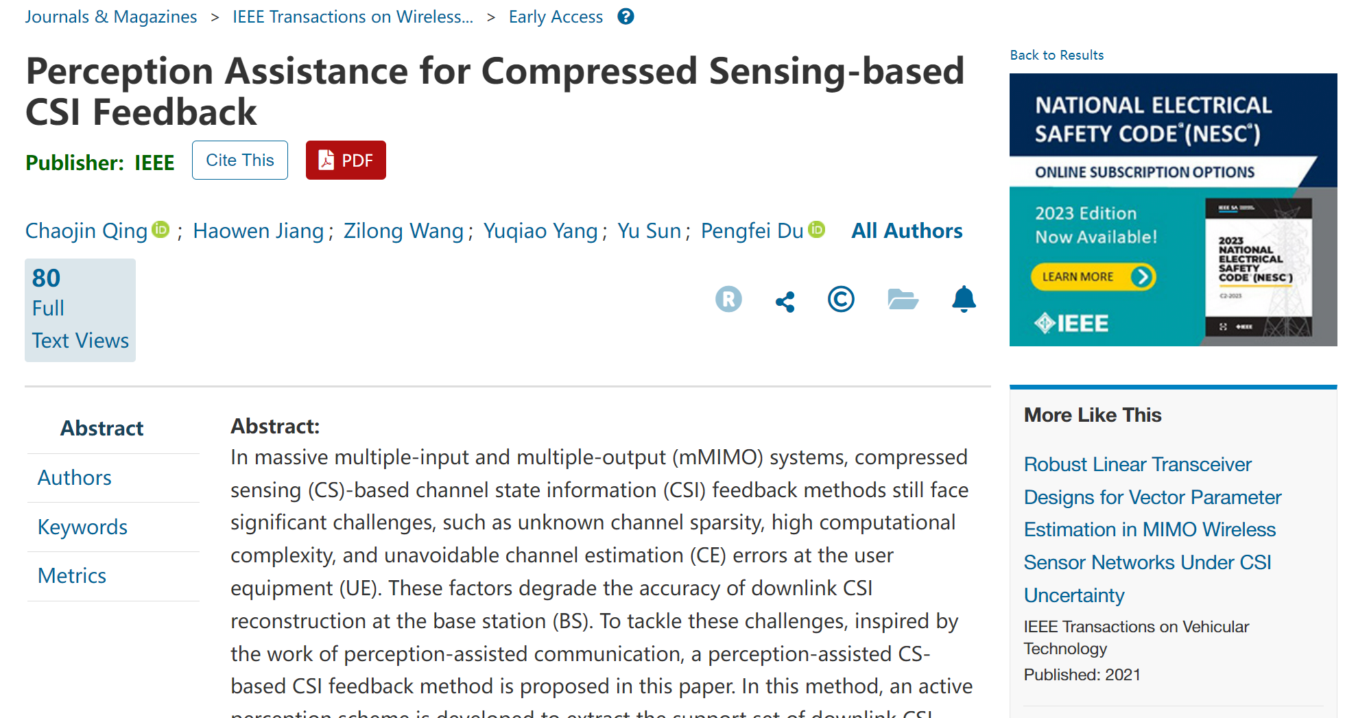针对5G/6G促生的通感一体化关键技术,WNCG团队已在无线通信物理层领域深耕八年,积累了丰富的研究成果。近期,团队在中科院SCI一区TOP期刊《IEEE Transactions on Wireless Communications》和《Chinese Journal of Aeronautics》分别发表题为“Perception Assistance for Compressed Sensing-based CSI Feedback”与“Environmental Sensing-assisted Off-grid Channel Estimation in UAV-enabled OTFS-ISAC Systems”的研究论文。此外,团队近来还在多个知名期刊上连续发表多项成果,包括《IEEE Transactions on Vehicular Technology》(中科院SCI二区TOP期刊)的“Timing Synchronization in UAV-assisted OFDM Systems Utilizing Sensing Prior Information”、《Signal Processing》(中科院SCI二区期刊)的“Sensing-assisted CSI Feedback by Leveraging Communication Echoes”、以及《IEEE Transactions on Green Communications and Networking》(中科院SCI二区期刊)的“Perception Service-aided Channel Estimation in Wireless Communication Systems”。
