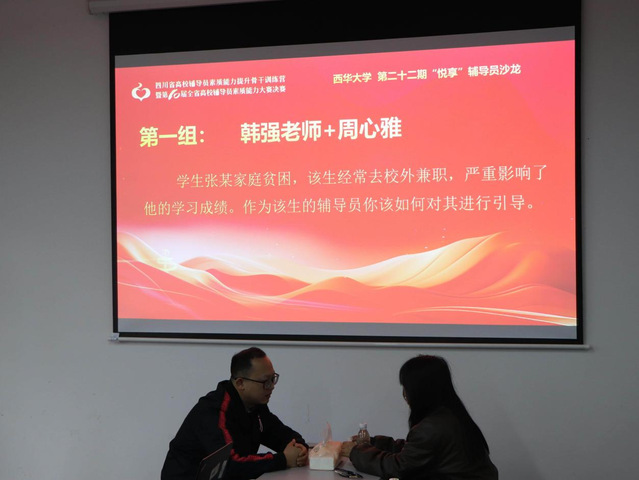 现场,三组师生现场进行了案例演示。其中,韩强老师与周心雅同学围绕“家庭经济困难学生因校外兼职影响学业”这一情景展开谈心互动。胡湘敏老师随后进行精准点评,提出优化建议。