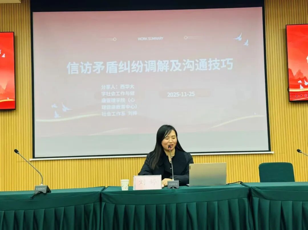 11月25日,眉山市东坡区委社会工作部举办“信访矛盾纠纷调解及沟通技巧”专题培训。社会工作与健康管理学院(心理健康教育中心)社工系主任、副教授刘婷受邀担任主讲,为参训人员带来一堂内容丰富、贴近实务的赋能课程。