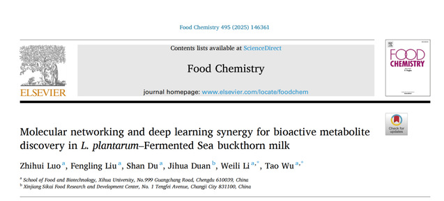 近日,食品与生物工程学院吴韬教授团队在食品领域TOP期刊《Food Chemistry》(Q1,IF: 9.8)发表题为“Molecular networking and deep learning synergy for bioactive metabolite discovery in L. plantarum–Fermented Sea buckthorn milk”的研究论文。食品与生物工程学院2022级农业专业硕士研究生罗智慧为第一作者,李伟丽教授和吴韬教授为本文的共同通讯作者。