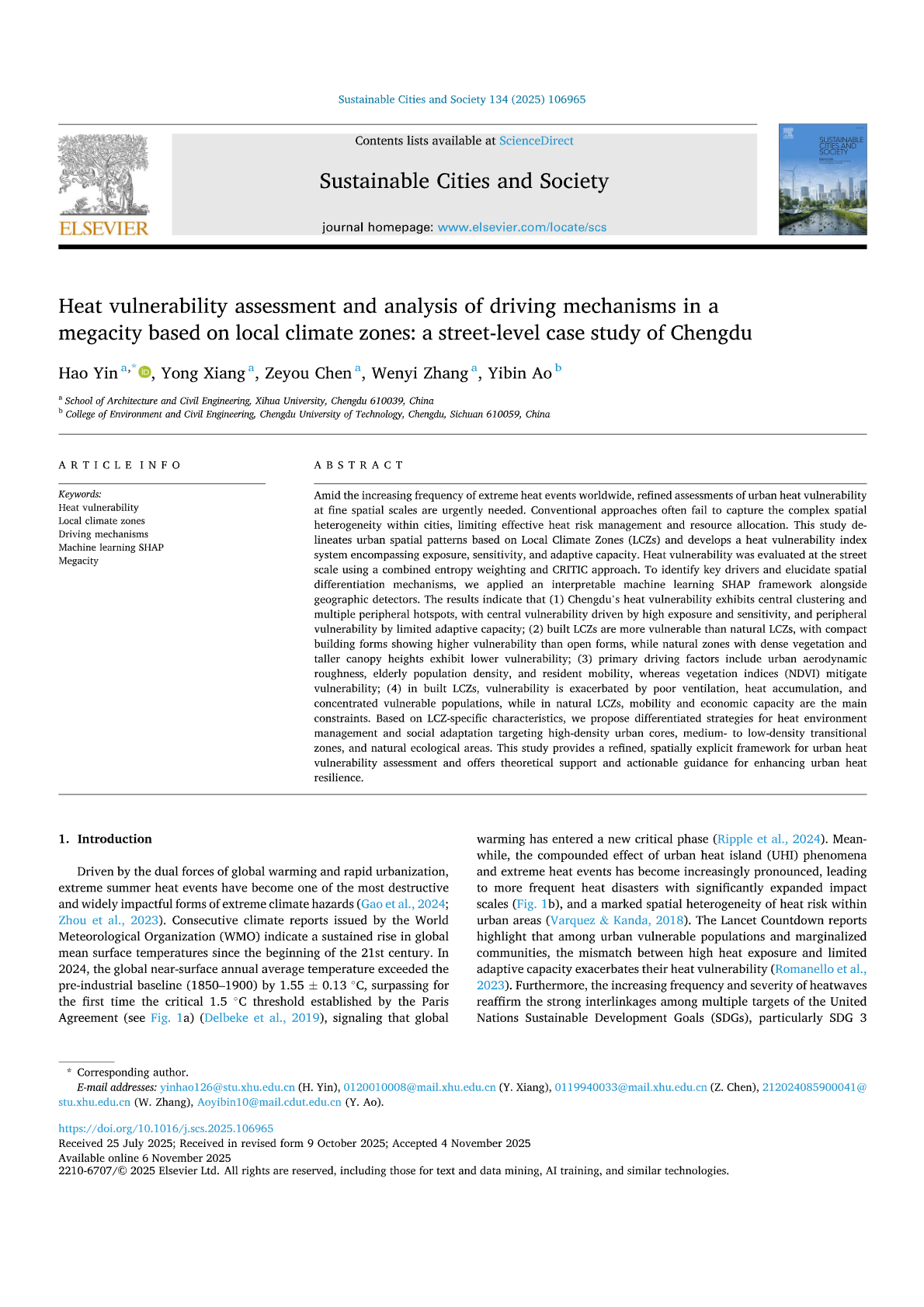 近日,建筑与土木工程学院项勇教授团队在国际知名TOP期刊《Sustainable Cities and Society》(一区TOP,IF:12.0)发表题为“Heat vulnerability assessment and analysis of driving mechanisms in a megacity based on local climate zones: a street- level case study of Chengdu”的研究论文。建筑与土木工程学院2023级硕士研究生殷豪为论文的第一作者,项勇教授为论文的第二作者兼通讯作者,陈泽友副教授为第三作者,均为该研究工作提供了全程指导。