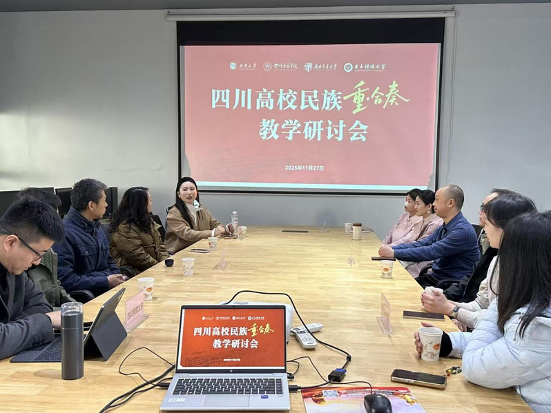 当日下午,学院器乐教研室与四川音乐学院、电子科技大学、西南交通大学器乐专业教师就“四川高校民族重合奏”进行专题教学研讨。与会教师围绕乐团建设发展路径展开充分讨论,并就曲目选择、排练模式、声部编制等具体议题进行深入交流。
