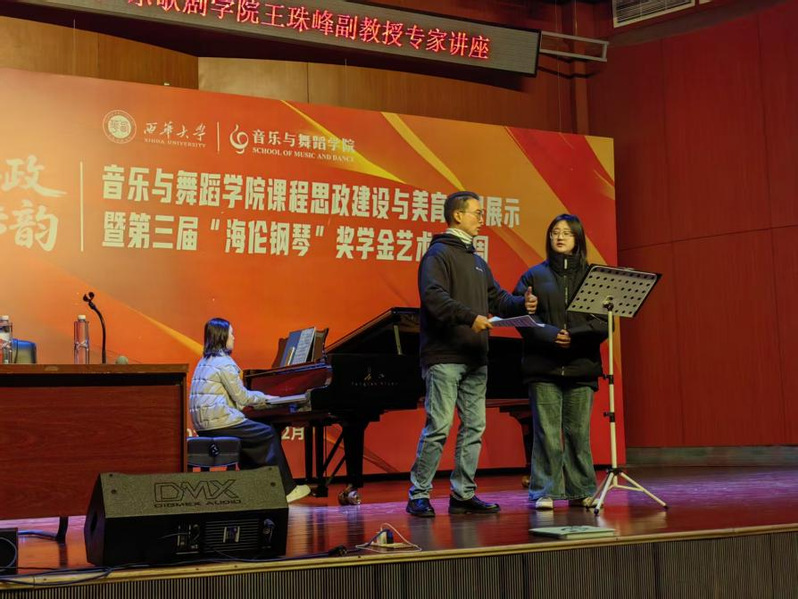 实践教学环节中,2025级学生张思彤、施德喜,2024级学生苟乐豪、王琪以及2023级学生罗曼先后登台,演唱了《春思曲》《望乡词》《再看一眼亲人》《假如你爱我》《赤子情》等音乐作品。王珠峰副教授逐一进行细致点评与针对性指导,从作品背景、情感表达到气息控制、共鸣运用等方面展开互动教学,帮助同学们在真实演唱中落实技巧、提升艺术表现力。