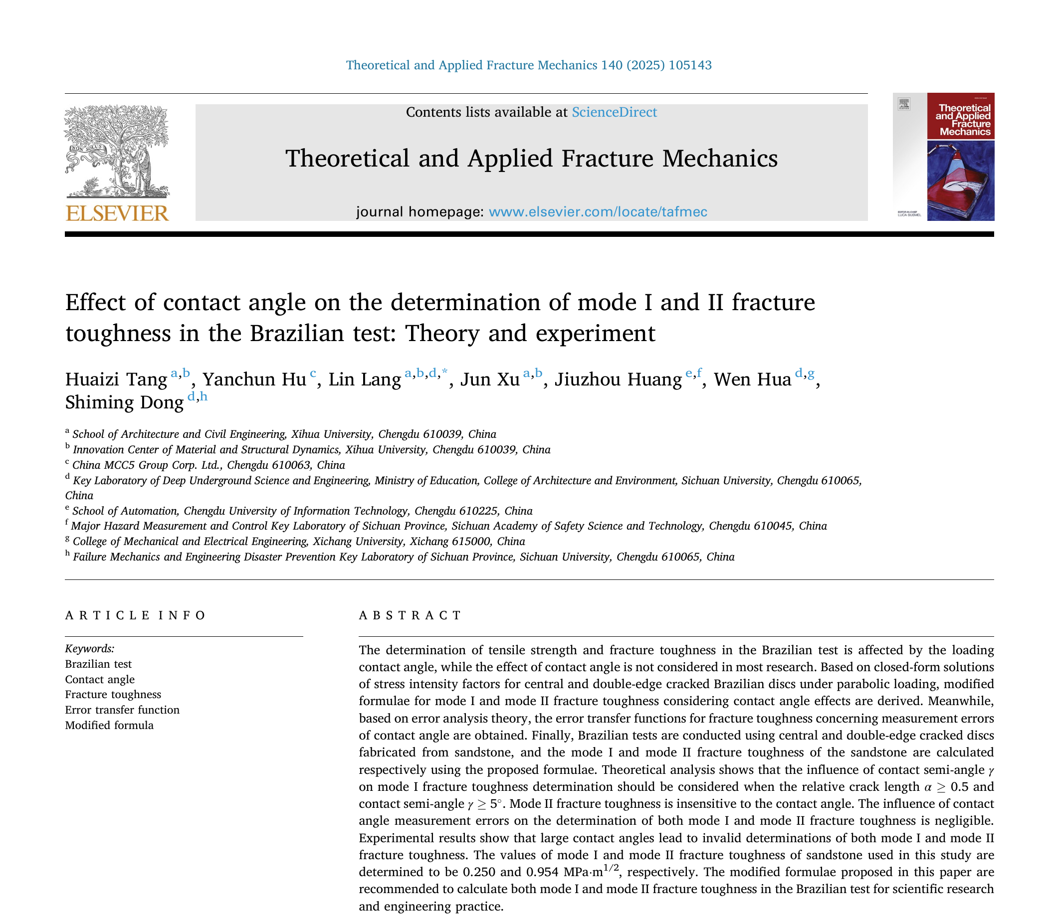 近日,建筑与土木工程学院材料与结构动力学创新研究团队在国际知名期刊《Theoretical and Applied Fracture Mechanics》(JCR一区、中科院二区TOP,IF=5.6)和《Archive of Applied Mechanics》(JCR二区、中科院三区,IF=2.5)分别发表题为“Effect of contact angle on the determination of mode I and II fracture toughness in the Brazilian test: Theory and experiment”和“Effect of contact angle on the determination of tensile strength in the Brazilian test”的系列研究成果。西华大学为论文第一单位,建筑与土木工程学院郎林副教授为通讯作者,团队汤淮子博士为第一作者、徐军博士为参与作者。