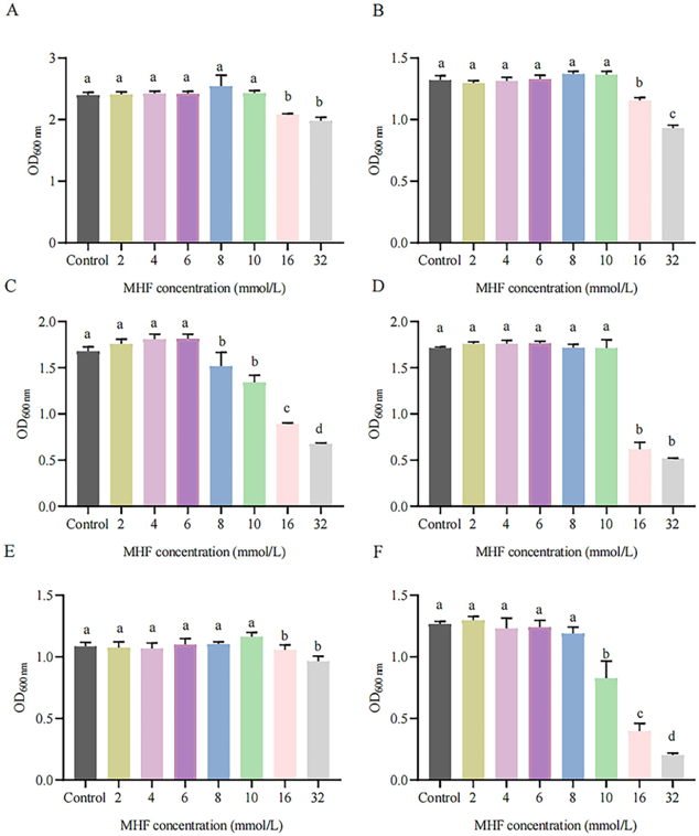 不同MHF浓度对(A)植物乳杆菌、(B)阴沟肠杆菌、(C)特雷维桑克氏菌、(D)尤因氏假单胞菌、(E)毕赤酵母属以及(F)热带假丝酵母生长的影响