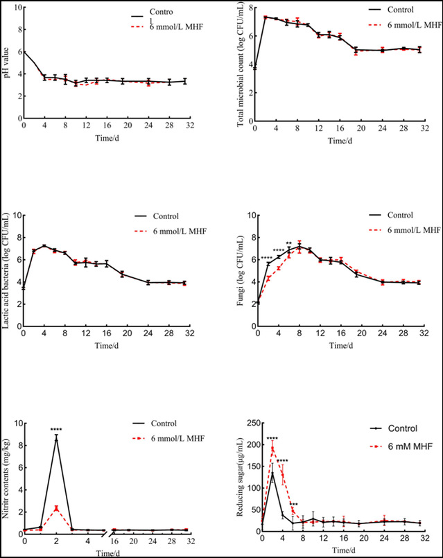 泡菜发酵过程中,MHF组和对照组的(A)pH 值、(B)微生物总数、(C)乳酸菌(LAB)、(D)真菌、(E)亚硝酸盐含量以及(F)还原糖水平的变化