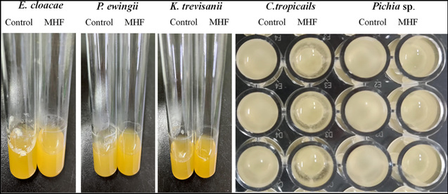 MHF对阴沟肠杆菌、尤因氏假单胞菌、特雷维桑克雷伯菌、热带假丝酵母和毕赤酵母属生物膜形成的影响