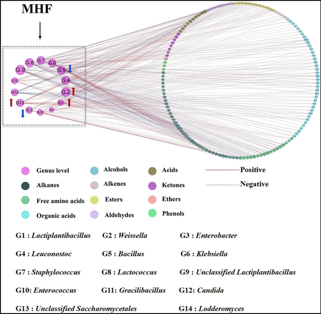 发酵豇豆在前 31 天内微生物与风味物质之间的相关性网络分析