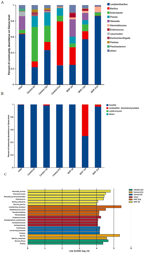 不同泡菜组中属水平的(A)细菌和(B)真菌相对丰度。(C)线性判别分析效应量(LEfSe)分析中,线性判别分析(LDA)对数得分阈值≥4的细菌