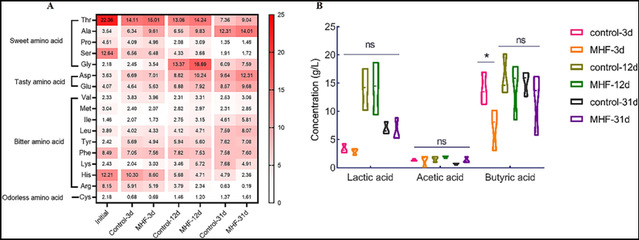 对照组和MHF组发酵过程中(A)FAA 和(B)有机酸含量的变化