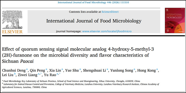 近日,食品与生物工程学院饶瑜教授团队在食品领域TOP期刊《International Journal of Food Microbiology》(中科院一区TOP)发表题为“Effect of quorum sensing signal molecular analog 4-hydroxy-5-methyl-3(2H)-furanone on the microbial diversity and flavor characteristics of Sichuan Paocai”的研究论文。2023级硕士研究生邓春辉为第一作者,饶瑜教授和梁紫微博士为本文的共同通讯作者。