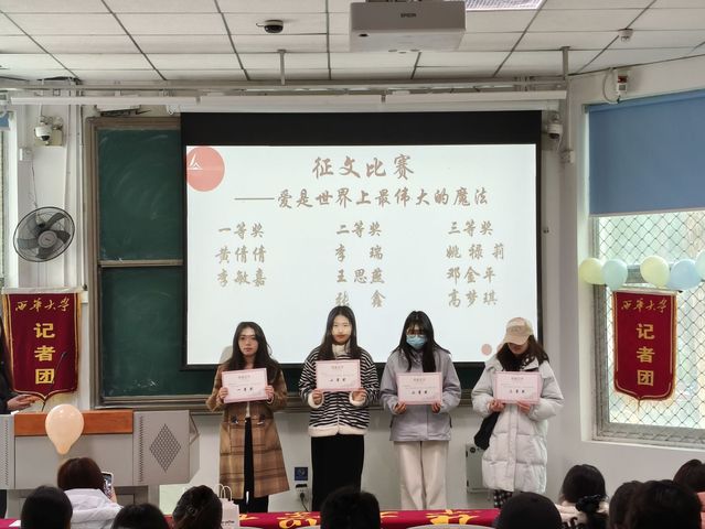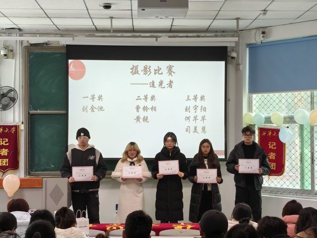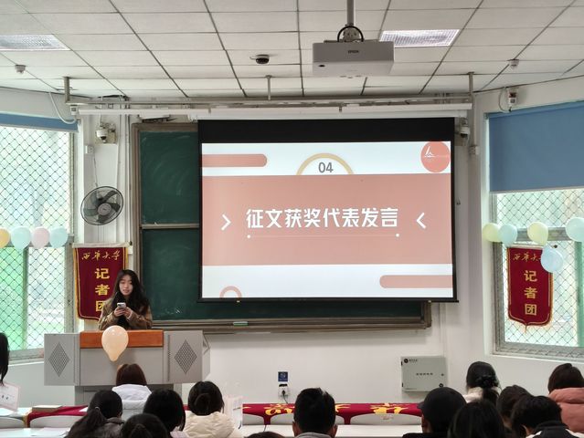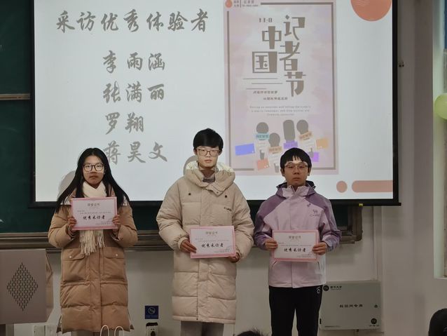 随后进行颁奖环节,在征文比赛、摄影比赛、主题采访等活动中表现突出的同学依次上台领取荣誉证书。获奖代表李敏嘉分享了创作体会与活动心得。