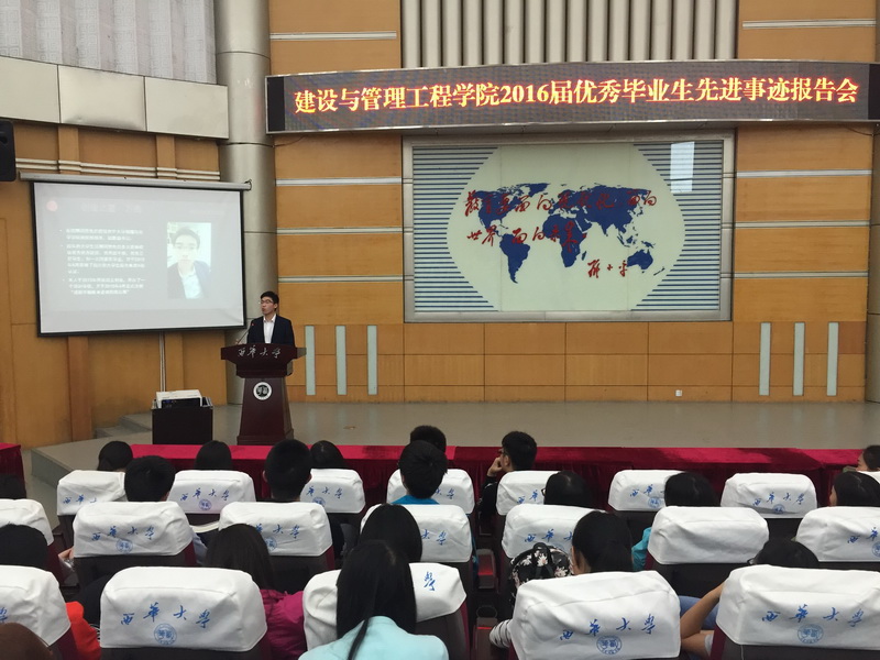 5月26日12:20,建设与管理工程学院在四教报告厅举行了2016届毕业生先进事迹报告会。来自学院的六名优秀毕业生向同学们分享了自己的大学经历。学院三百余名学生代表参加了此次报告会。 大会伊始,主持人向同学们简单地介绍了六位优秀毕业生的基本情况。随后,来自工程造价专业的“学习之星”陈美灵向大家分享了自己的大学生活,她提到自己在专业中取得的优异成绩,以及大学期间参加的活动、学到的技能。 其次,工程管理专业的“考研之星”严茗茗分享了自己的考研经历,并总结了三点经验:明确目标、选择学校、学习方法。接下来,学生会主席周莉婷讲述了自己从干事到部长再到主席以及后来参加跨专业面试实习的一些工作经历。她提到,正是学生会中繁忙的工作锻炼了她的个人能力,让她在多家公司的面试实习中取得了优秀的成绩,并鼓励同学们多参与一些活动去提高自己的能力。 随后物流管理专业的“工作之星”屈力波分享了他的大学生活:参加团委学生会宣传部和青志联两个部门,学吉他、学日语,参加翻译大赛、配音大赛等。他告诉同学们大学期间应该积极参与各种活动,找到自己的兴趣特长,提高自己的个人素质。 紧接着,“就业之星”罗贤新和大家分享了关于就业的问题,对于现在较为严峻的就业形势,他提出了四个建议:一是学习,专业成绩的基础是未来工作的基础;二是实习,工作是理论和实践的结合;三是心态,保持平稳心态,谨慎选择工作,冷静面对面试;四是准备,为将来进行准备,提高能力,锻炼自我。最后,“创业之星”万鑫详述了自己的创业之路。 至此,本次报告会圆满结束。优秀毕业生的大学总结鼓励了同学们,也使他们对大学生活有了更加深刻的认识,对于自己怎样规划大学生活也有了更为明确的目标和蓝图。
