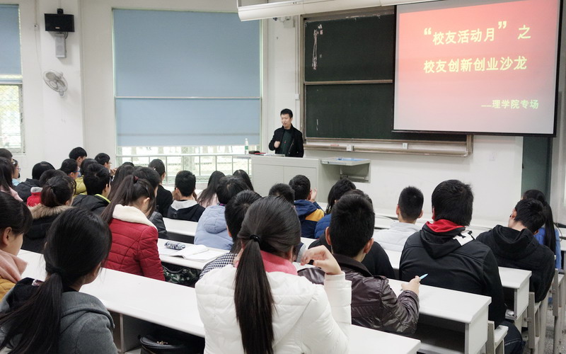 近日,我校第四届“校友活动月”顺利展开。12月5日下午,理学院在4A-101教室召开创新创业沙龙分享会。90级工民建专业校友薛科峰应邀给部分在校学生作了创新创业思想交流和经验分享。本次分享会由王婕主持。